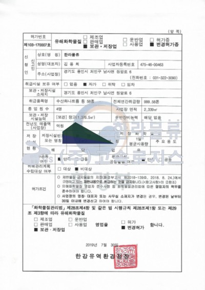 한라물류 유해화학물질관리자신고증