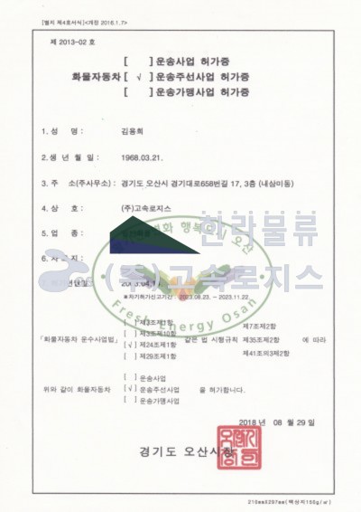 고속로지스 운송사업허가증